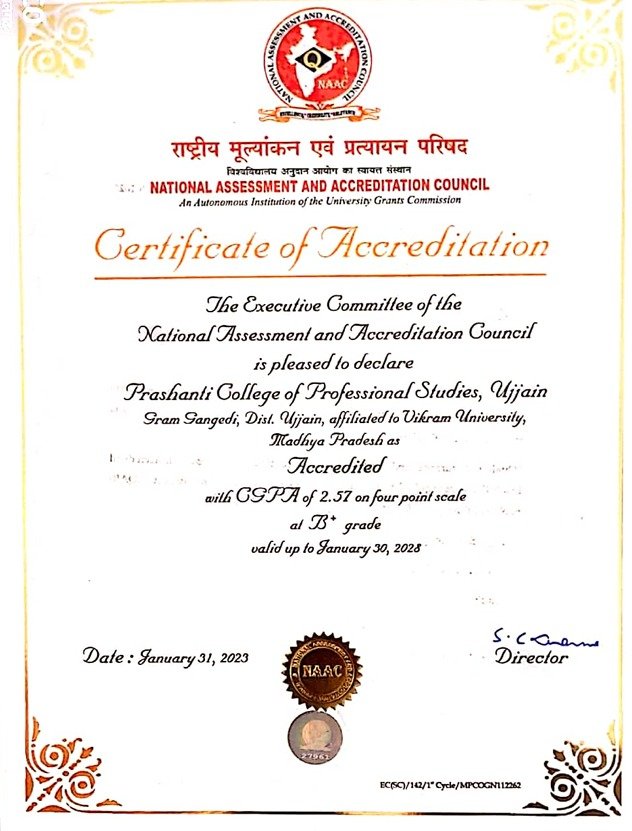 Prashanti College of Professional Studies is a NAAC Accredited Institute with B+ Grade, reflecting its strong adherence to national quality benchmarks in higher education. The accreditation signifies the institution’s commitment to academic excellence, effective teaching-learning practices, transparent governance, and robust student support systems. The college consistently works towards creating a learner-centric academic environment supported by qualified faculty, well-planned curriculum delivery, and continuous evaluation mechanisms. Emphasis is placed on professional ethics, research orientation, innovation in pedagogy, and the holistic development of student-teachers. Through structured academic planning, quality assurance practices, and inclusive institutional policies, Prashanti College of Professional Studies ensures continuous improvement in all aspects of education, thereby preparing competent, responsible, and socially committed educators who can contribute meaningfully to the nation’s educational development.
